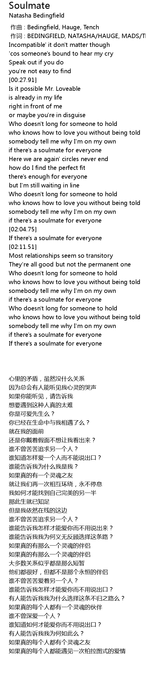 | [00:01.00] | 作词 : BEDINGFIELD, NATASHA/HAUGE, MADS/TENCH, DAVID |