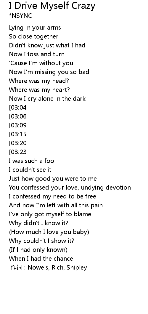| [03:32][03:09][01:57][00:57] | Drive myself crazy thinking of you |