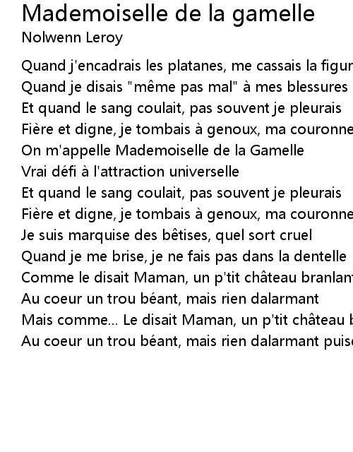 | [00:58.404] | On m' appelle Mademoiselle de la Gamelle |