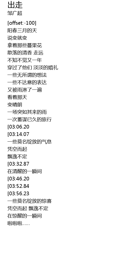 | [01:46.12][03:06.20] | 我终于从梦里出走 |