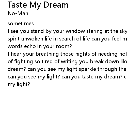 | I hear your breathing those nights of needing hold onto something wild so sick of fighting so tired of writing you break down like a child can you taste my dream? can you see my light sparkle through the gloom? can you taste my dream? can you see my light? can you taste my dream? can you see my light? can you see my light? |