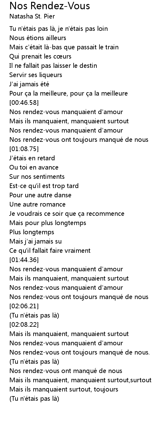 | [00:46.85] | Nos rendez-vous manquaient d'amour |