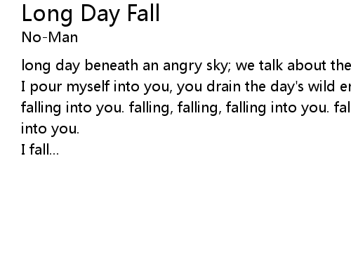 | I pour myself into you, you drain the day's wild energy. falling, falling, falling into you. falling, falling, falling into you. falling, falling, falling into you. | |