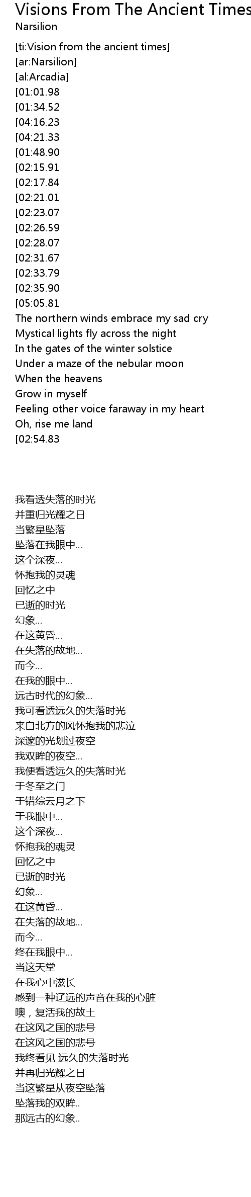| [01:27.24][05:05.81] | Visions from ancient times... |