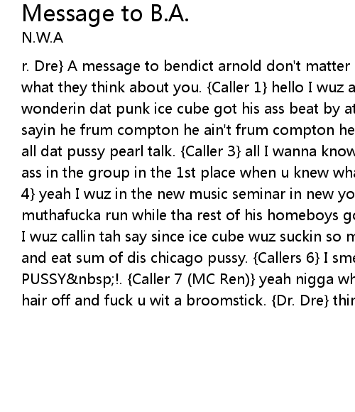 r. Dre} A message to bendict arnold don't matter how hard you try to be here's what they think about you. {Caller 1} hello I wuz at celebreality and I wuz wonderin dat punk ice cube got his ass beat by atl. {Caller 2} yo dat nigga wuz sayin he frum compton he ain't frum compton he frum a planet called punk with all dat pussy pearl talk. {Caller 3} all I wanna know iz why yall let his punk ass in the group in the 1st place when u knew what kinda bitch he wuz. {Caller 4} yeah I wuz in the new music seminar in new york and I watch that punk muthafucka run while tha rest of his homeboys got dey ass beat {Caller 5} hello I wuz callin tah say since ice cube wuz suckin so much new york dick can he come and eat sum of dis chicago pussy. {Callers 6} I smell *sniff *sniff PUSSY !. {Caller 7 (MC Ren)} yeah nigga when we see yo azz we go cut your hair off and fuck u wit a broomstick. {Dr. Dre} think about punk muthafucka |