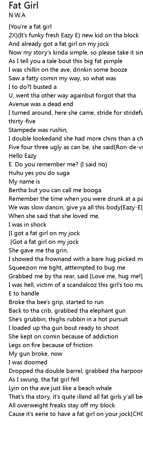 [Fat girl!][You're a fat girl][Fat...fat...fat fat fat fat girl] (repeat 2X)(It's funky fresh Eazy E) new kid on tha block |
