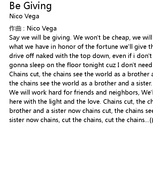 | Say we will be giving. We won' t be cheap, we will be willing. We' ll pray for what we have in honor of the fortune we' ll give thanks to the past. I' m gonna drive off naked with the top down, even if i don' t make it to the next town, I' m gonna sleep on the floor tonight cuz I don' t need a damn bed to survive on. Chains cut, the chains see the world as a brother and a sister now Chains cut, the chains see the world as a brother and a sister. We' re free... from the labor. We will work hard for friends and neighbors, We' ll stay up above cause we belong here with the light and the love. Chains cut, the chains see the world as a brother and a sister now chains cut, the chains see the world as a brother and a sister now chains, cut the chains, cut the chains... repeat first verse |
