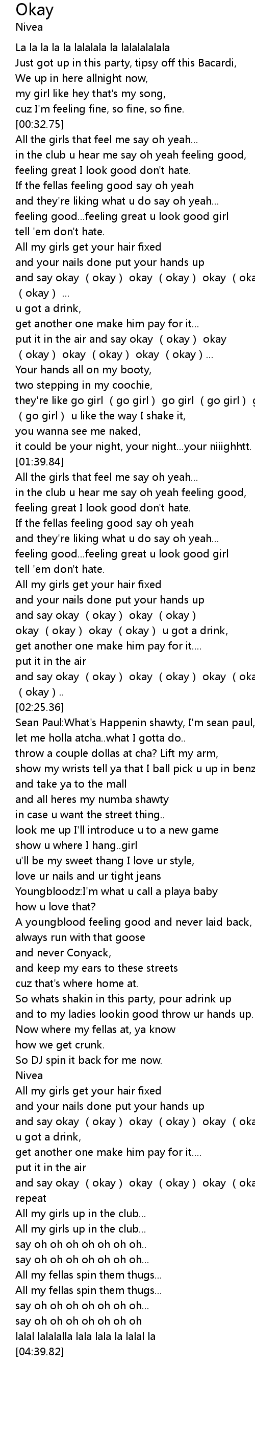 | [02:19.37] | and say okay (okay) okay (okay) okay (okay) okay (okay).. |
