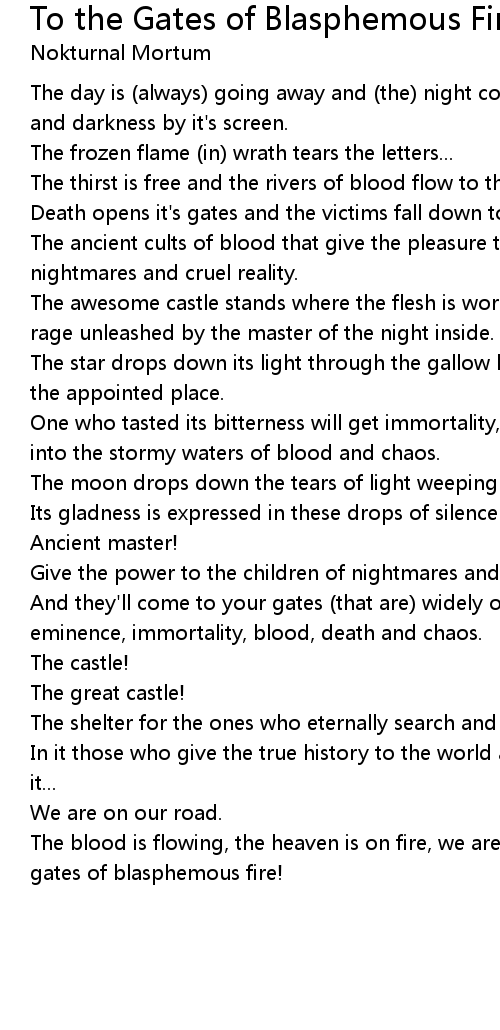 The blood is flowing, the heaven is on fire, we are awaited by chaos... to the gates of blasphemous fire! |