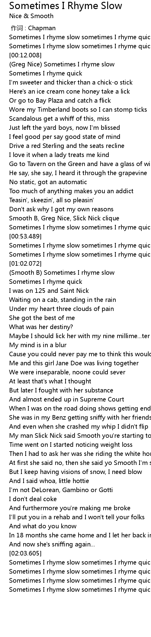 | [00:55.202] | Sometimes I rhyme slow sometimes I rhyme quick |