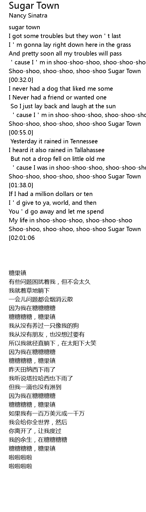 | [00:52.120] | Shoo-shoo, shoo-shoo, shoo-shoo Sugar Town |