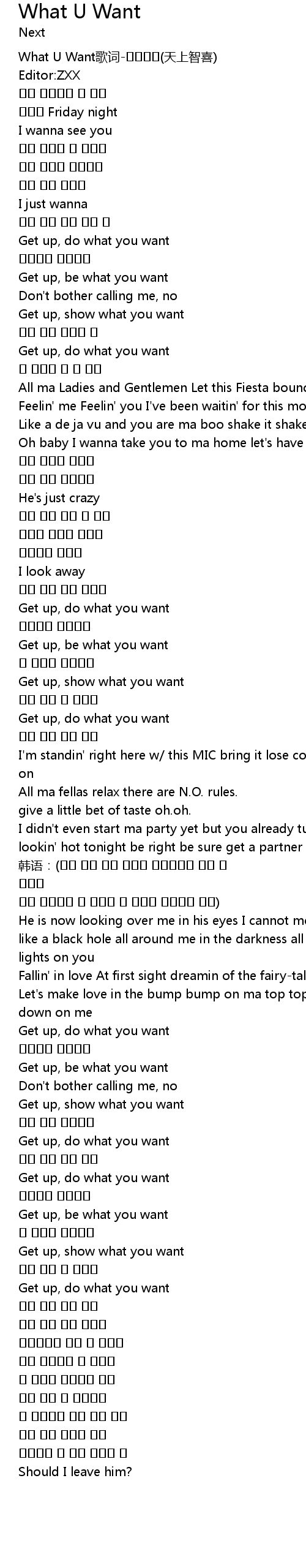 | [00:13.12] | What U Want gē cí tiān shàng zhì xǐ |