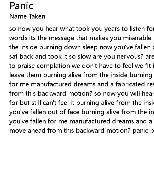 so now you hear what took you years to listen for but still i can't make out the words its the message that makes you miserable but still... burning alive from the inside burning down sleep now you've fallen out of face panic at the disco sat back and took it so slow are you nervous? are you shaking? save compliments to praise complation we don't have to feel we fit in we can move back we can leave them burning alive from the inside burning down sleep now you've fallen for me manufactured dreams and a fabricated resolution how can we move ahead from this backward motion? so now you will hear what took you years to listen for but still can't feel it burning alive from the inside burning down sleep now you've fallen out of face burning alive from the inside burning down sleep now you've fallen for me manufactured dreams and a fabricated resolution how can we move ahead from this backward motion? panic panic panic panic |
