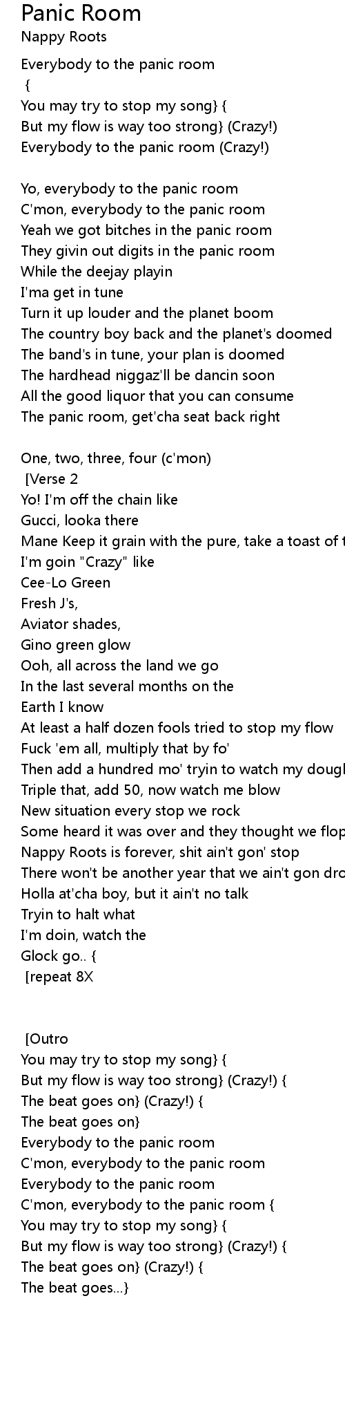 C'mon, verybody to the panic room [Chorus] [Outro] { |