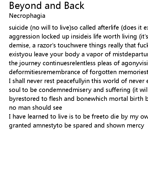 suicide (no will to live)so called afterlife (does it exist)depression, aggression locked up insideis life worth living (it's time to decide)your demise, a razor's touchwere things really that fuckedburn as you cease to existyou leave your body a vapor of mistdeparture enter the unknownhorrified as the journey continuesrelentless pleas of agonyvisions of grotesques deformitiesremembrance of forgotten memoriesto dwell and rot in purgatory |