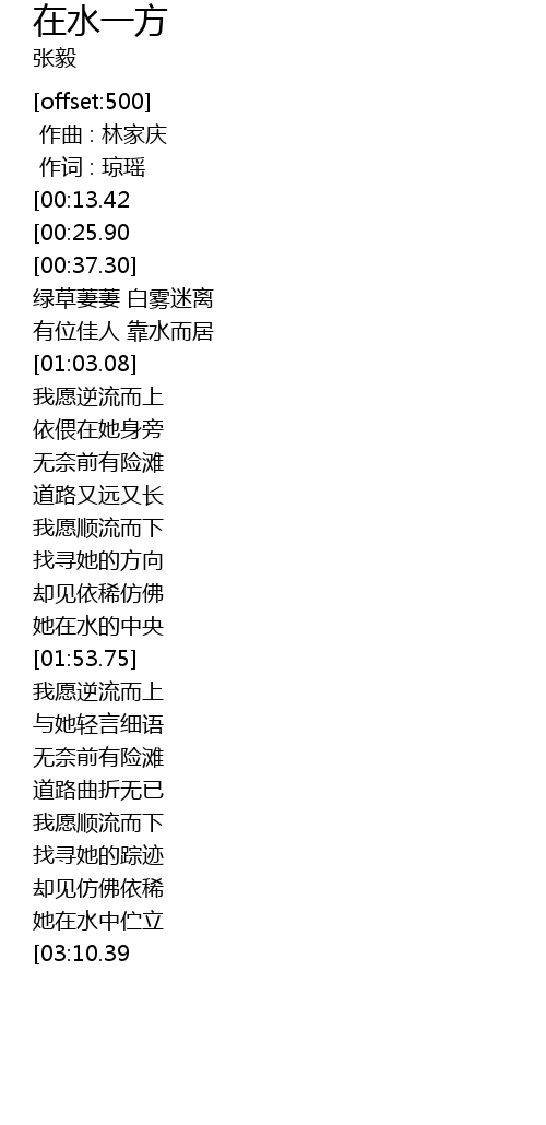 | [03:24.29][00:25.90] | 有位佳人 在水一方 |