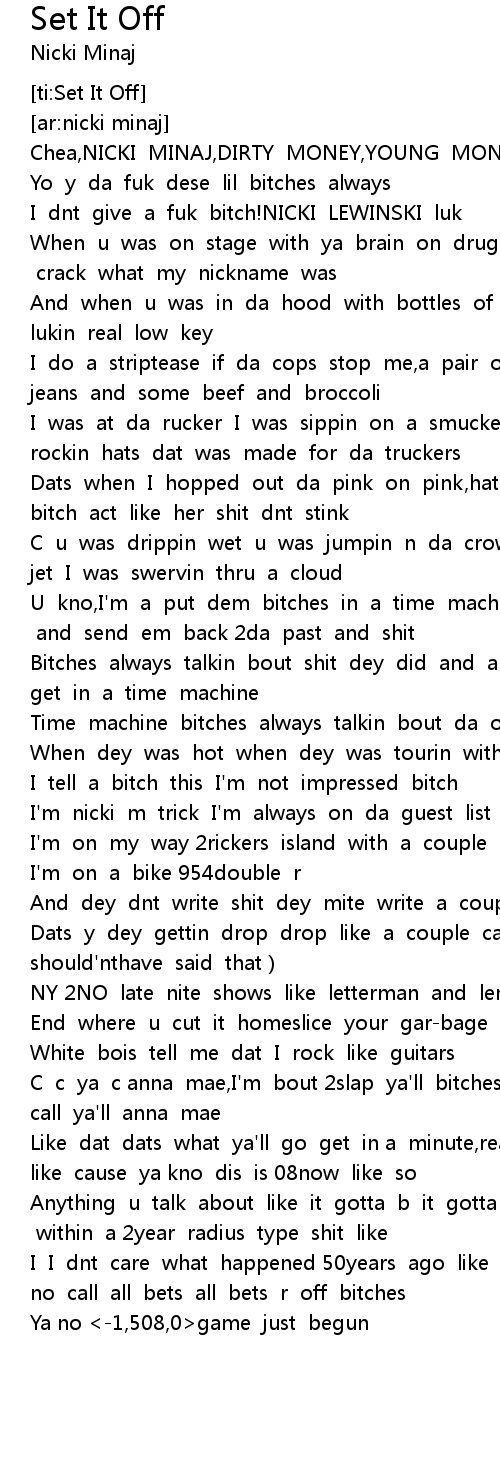 | [01:11.419] | I'm nicki m trick I'm always on da guest list |