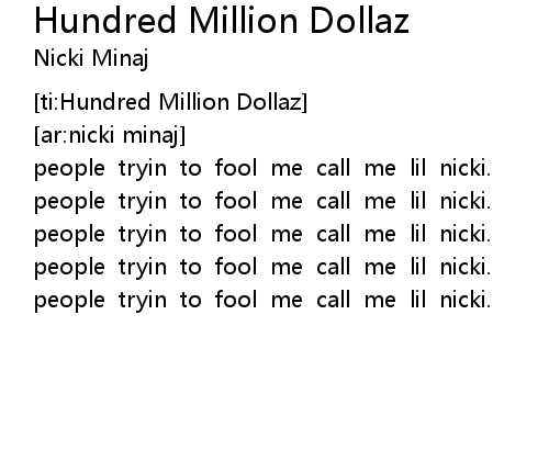 | [00:00.537] | people tryin to fool me call me lil nicki. |