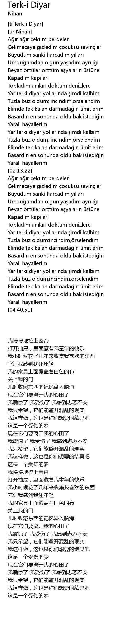 | [03:12.54] | Yar terki diyar yollar nda imdi kalbim |