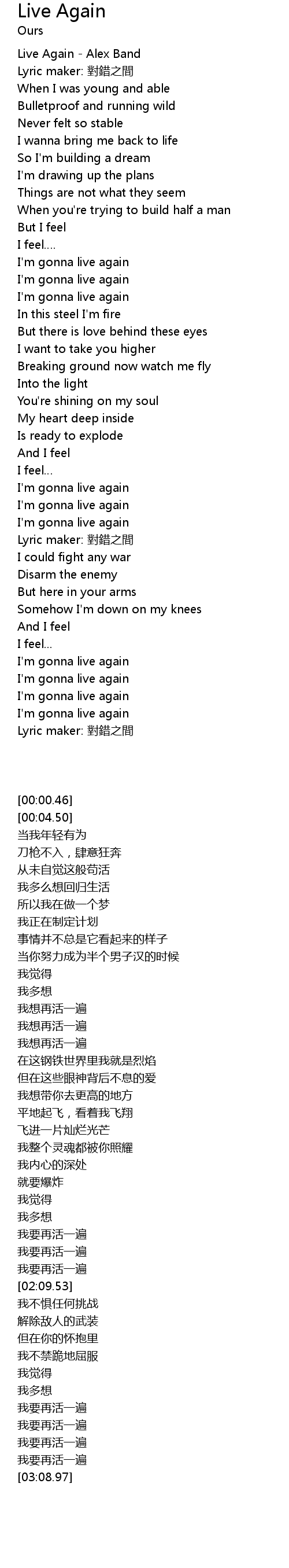 | [00:00.46] | Live Again Alex Band |