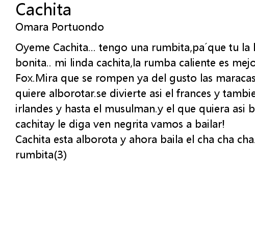 | Oyeme Cachita... tengo una rumbita,pa´que tu la bailes como bailo yo.muchacha bonita.. mi linda cachita,la rumba caliente es mejor que el | |
