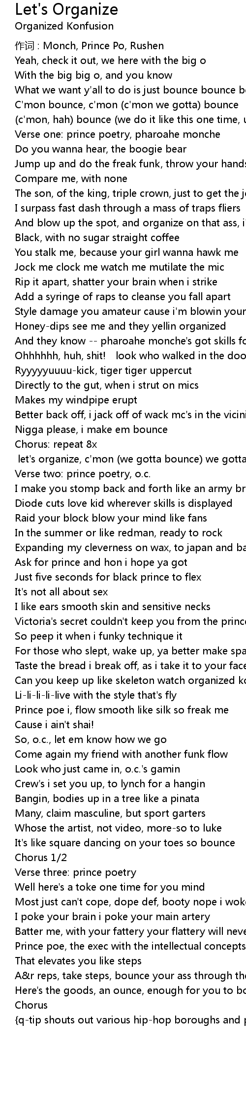 | qtip let' s organize, c' mon we gotta bounce we gotta bounce | |