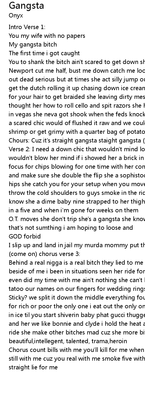 Verse 2: I need a down chic that wouldn't mind loading the clip and that wouldn't blow her mind if i showed her a brick in and outta the grind with a focus for chips blowing for one time with her controling the wip re-up for me and make sure she double the flip she a sophistocated thug bitch that move her hips she catch you for your setup when you move ya shit but most of the time she throw the cold shoulders to guys smoke in the ride hooded low over her eyes she know she a dime baby nine strapped to her thighs gotta be live help me count doe in a five and when i'm gone for weeks on them