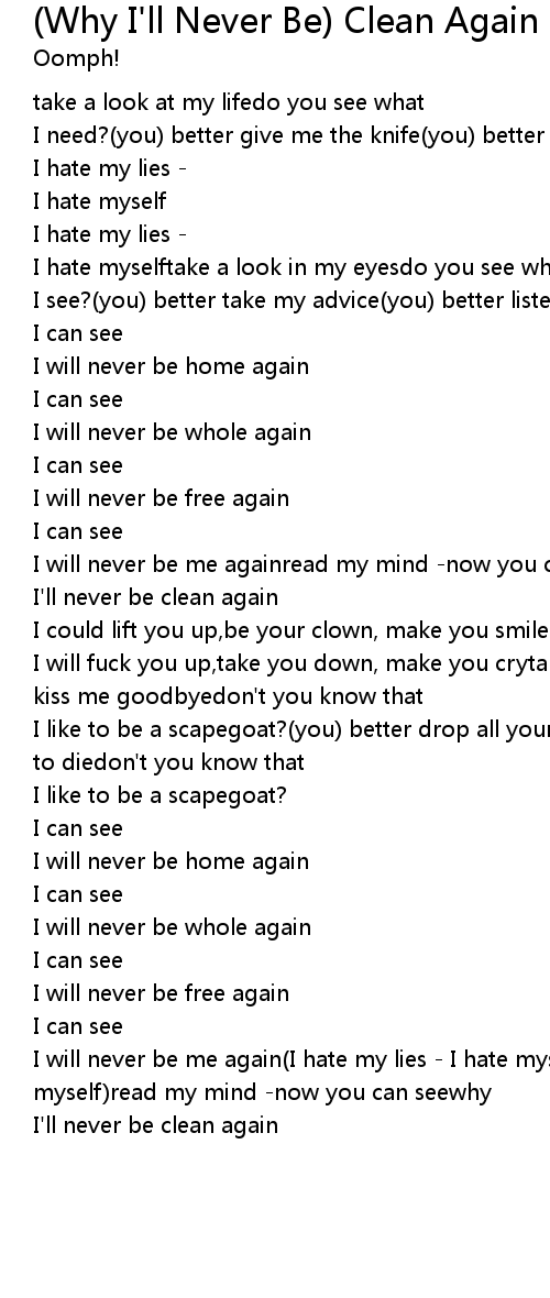 | I will never be me again(I hate my lies - I hate myself)(I hate my lies - I hate myself)read my mind -now you can seewhy | |