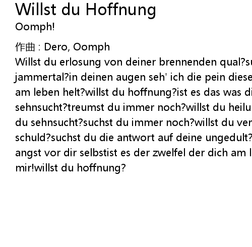 | Willst du erlosung von deiner brennenden qual?suchst du den ausweg aus diesem jammertal?in deinen augen seh' ich die pein dieser weltist es die suche die dich am leben helt?willst du hoffnung?ist es das was dir fehlt?hast du sehnsucht?treumst du immer noch?willst du heilung?ist es das was dich quelt?hast du sehnsucht?suchst du immer noch?willst du vergebung fur deine endlose schuld?suchst du die antwort auf deine ungedult?in deinen augen seh' ich die angst vor dir selbstist es der zwelfel der dich am leben helt?gott!vater vergib mir!willst du hoffnung? |