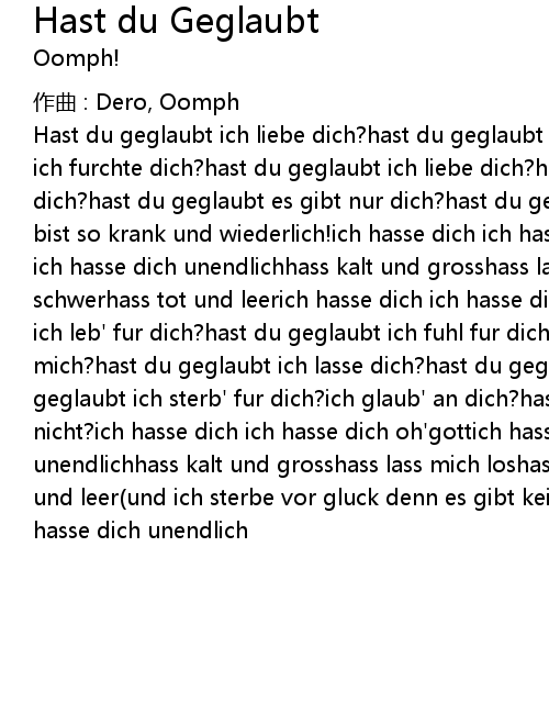 | Hast du geglaubt ich liebe dich? hast du geglaubt ich achte dich? hast du geglaubt ich furchte dich? hast du geglaubt ich liebe dich? hast du geglaubt ich wein' um dich? hast du geglaubt es gibt nur dich? hast du geglaubt ich kenn' dich nicht? du bist so krank und wiederlich! ich hasse dich ich hasse dich oh' gottich hasse dich ich hasse dich unendlichhass kalt und grosshass lass mich loshass schwarz und schwerhass tot und leerich hasse dich ich hasse dich unendlichhast du geglaubt ich leb' fur dich? hast du geglaubt ich fuhl fur dich? hast du geglaubt du rettest mich? hast du geglaubt ich lasse dich? hast du geglaubt ich kempf' um dich? hast du geglaubt ich sterb' fur dich? ich glaub' an dich? hast du geglaubt ich luge nicht? ich hasse dich ich hasse dich oh' gottich hasse dich ich hasse dich unendlichhass kalt und grosshass lass mich loshass schwarz und schwerhass tot und leer und ich sterbe vor gluck denn es gibt kein zuruck ich hasse dichich hasse dich unendlich |
