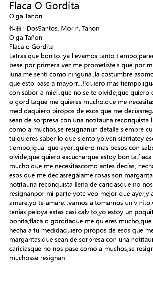 | Letras:que bonito..ya llevamos tanto tiempo,pareciera que fue ayer..cuando te bese por primera vez,me prometisteis que por mi morirías..me llevaste hasta la luna,me sentí como ninguna..la costumbre asomo,su cara a los dos,y yo no quiero que esto pase a mayorr...!!quiero mas tiempo,igual que ayer..quiero mas besos con sabor a miel..que no se te olvide,que quiero escucharque estoy bonita,flaca o gorditaque me quieres mucho,que me necesitascomo antes decías, hecha a tu medidaquiero piropos de esos que me decíasregálame rosas son margaritas,que sean de sorpresa con una notitauna reconquista llena de cariciasque no nos pase como a muchos,se resignanun detalle siempre cuenta,para que esto nunca muerasi tu quieres saber lo que siento yo,ven siéntatey escúchame por favor!quiero mas tiempo,igual que ayer..quiero mas besos con sabor a miel..que no se te olvide,que quiero escucharque estoy bonita,flaca o gorditaque me quieres mucho,que me necesitascomo antes decías, hecha a tu medidaquiero piropos de esos que me decíasregálame rosas son margaritas,que sean de sorpresa con una notitauna reconquista llena de cariciasque no nos pase como a muchos,se resignanpor mi parte yote veo mejor que ayer,y aunque pase el tiempo,yo te amare,yo te amare...vamos a tomarnos un vinito,vamos a recordar hasta cuando tu tenías peloya estas casi calvito,yo estoy un poquito mas gordita no?que estoy bonita,flaca o gorditaque me quieres mucho,que me necesitascomo antes decías, hecha a tu medidaquiero piropos de esos que me decíasregálame rosas son margaritas,que sean de sorpresa con una notitauna reconquista llena de cariciasque no nos pase como a muchos,se resignan..que no nos pase como a muchosse resignan |