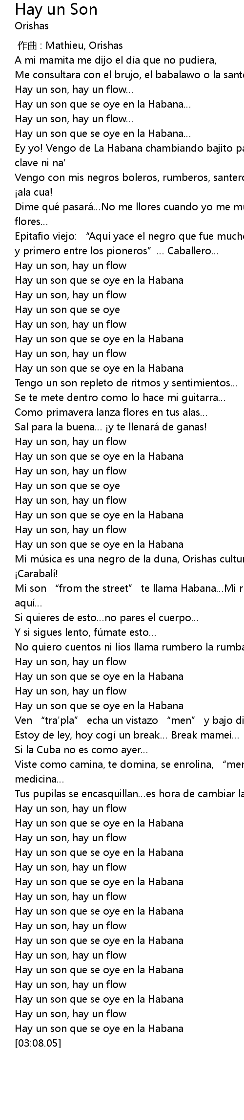 | [03:00.76] | Hay un son que se oye en la Habana |