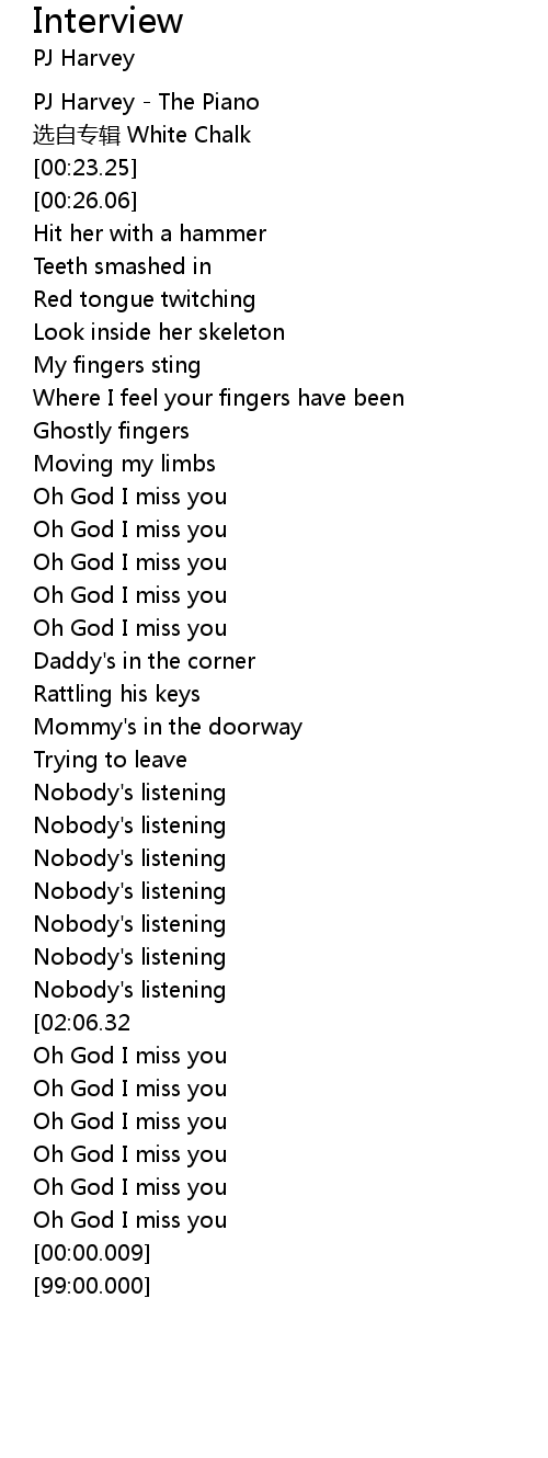 | [01:55.02][02:06.32][02:10.21][02:14.00] | Nobody's listening |