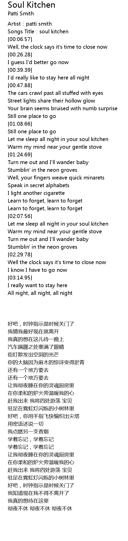 | [01:14.27] | Let me sleep all night in your soul kitchen |