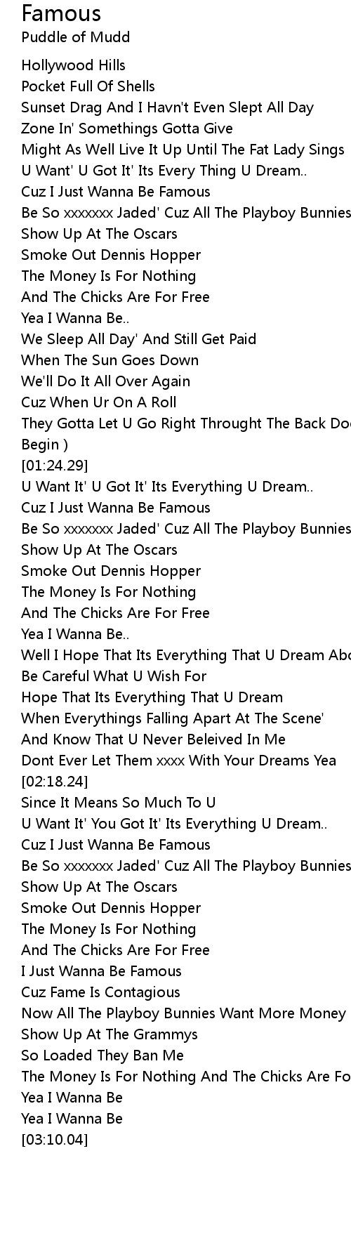 | [00:51.72] | Be So xxxxxxx Jaded' Cuz All The Playboy Bunnies Take My Money From Me |