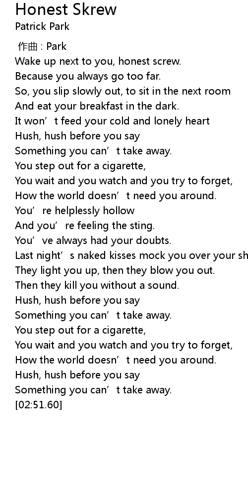 | [01:42.65] | Last night’s naked kisses mock you over your shoulder |