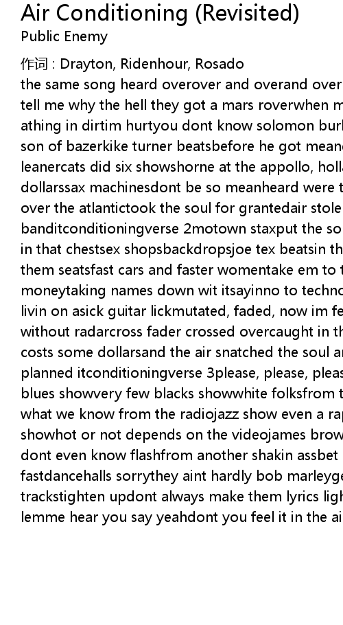| the same song heard overover and overand over and overand over and overgotta tell me why the hell they got a mars roverwhen much of arizonastill cant grow athing in dirtim hurtyou dont know solomon burkeor james brown did workor the son of bazerkike turner beatsbefore he got meaner wit tinawhen times were leanercats did six showshorne at the appollo, holladyamite shows below 5 dollarssax machinesdont be so meanheard were trumpetscmon can you jump itoff over the atlantictook the soul for grantedair stole the soul like a banditconditioningverse 2motown staxput the soul to restchess put the blues up in that chestsex shopsbackdropsjoe tex beatsin the middle of hip hopget em out them seatsfast cars and faster womentake em to the limitthe poetry of moneytaking names down wit itsayinno to technobeat it up too quickdark chords livin on asick guitar lickmutated, faded, now im feelin felahate i cant find it without radarcross fader crossed overcaught in the chaoscant hear want cause it costs some dollarsand the air snatched the soul and we abandonedi think somebody planned itconditioningverse 3please, please, pleasesoul dont grow on treeswhy a blues showvery few blacks showwhite folksfrom the front to the back rowwe know what we know from the radiojazz show even a rap showcan still be no black showhot or not depends on the videojames brownin townstill few of us aroundthey dont even know flashfrom another shakin assbet some cashsoul is dissapearin fastdancehalls sorrythey aint hardly bob marleyget that soul back on trackstighten updont always make them lyrics lighten upif the soul yall feelin, lemme hear you say yeahdont you feel it in the airconditioning |