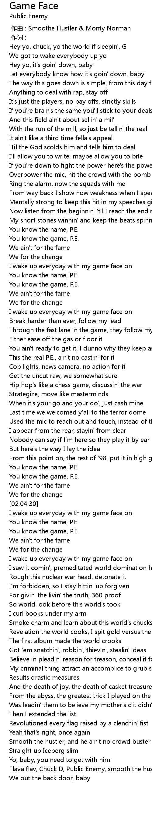 | [03:05.41] | Flava flav, Chuck D, Public Enemy, smooth the hustle |
