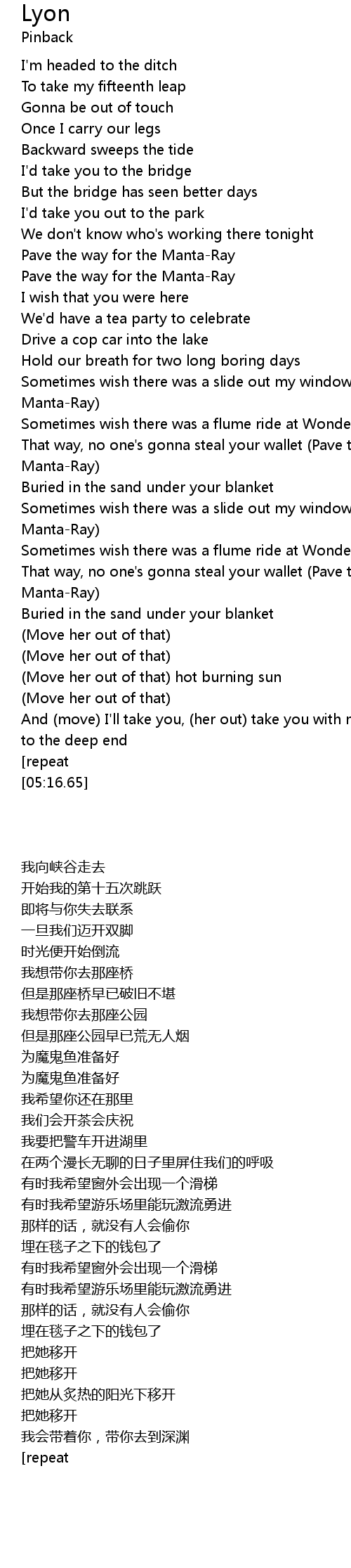 | [02:33.29] | Sometimes wish there was a slide out my window (Pave the way for the Manta-Ray) |