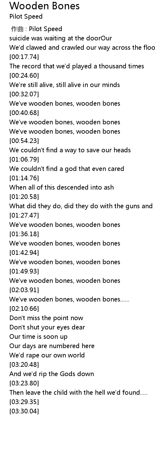 | [00:38.80] | We' ve wooden bones, wooden bones |
