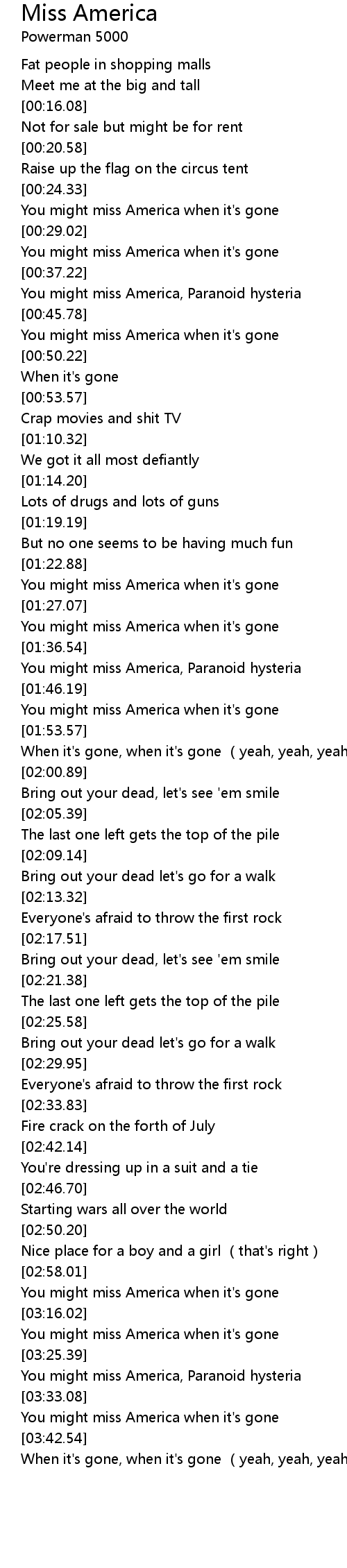 | [03:13.27] | You might miss America when it's gone |