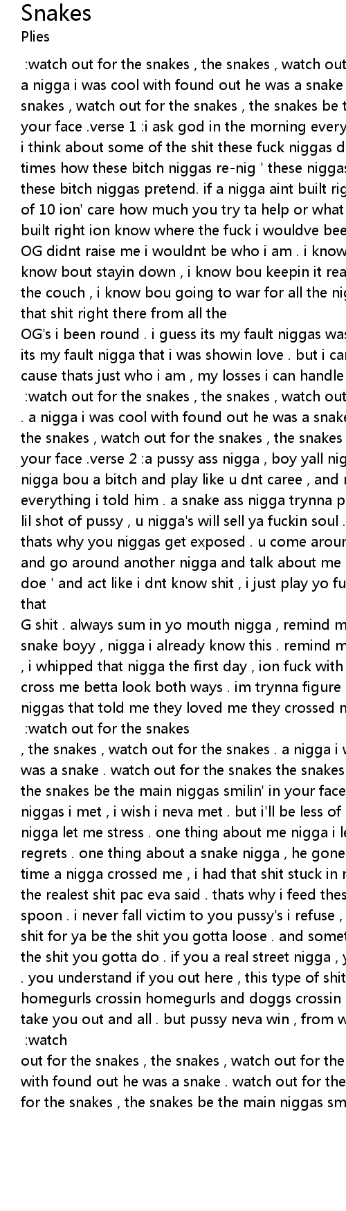 OG's i been round . i guess its my fault niggas wasnt built how i was , i guess its my fault nigga that i was showin love . but i can take that there nigga cause thats just who i am , my losses i can handle nigga i take em like a man .chorus [ x2] :watch out for the snakes , the snakes , watch out for the snakes . a nigga i was cool with found out he was a snake . watch out for the snakes the snakes , watch out for the snakes , the snakes be the main niggas smilin' in your face .verse 2 :a pussy ass nigga , boy yall niggas sum else . gone ask a nigga bou a bitch and play like u dnt caree , and run and tell the hoe everything i told him . a snake ass nigga trynna play like you a pimp . for a lil shot of pussy , u nigga's will sell ya fuckin soul .these dnt respect it , thats why you niggas get exposed . u come around me talkin about another nigga , and go around another nigga and talk about me nigga . but i just play it cool doe ' and act like i dnt know shit , i just play yo fuck ass . nigga that be that |