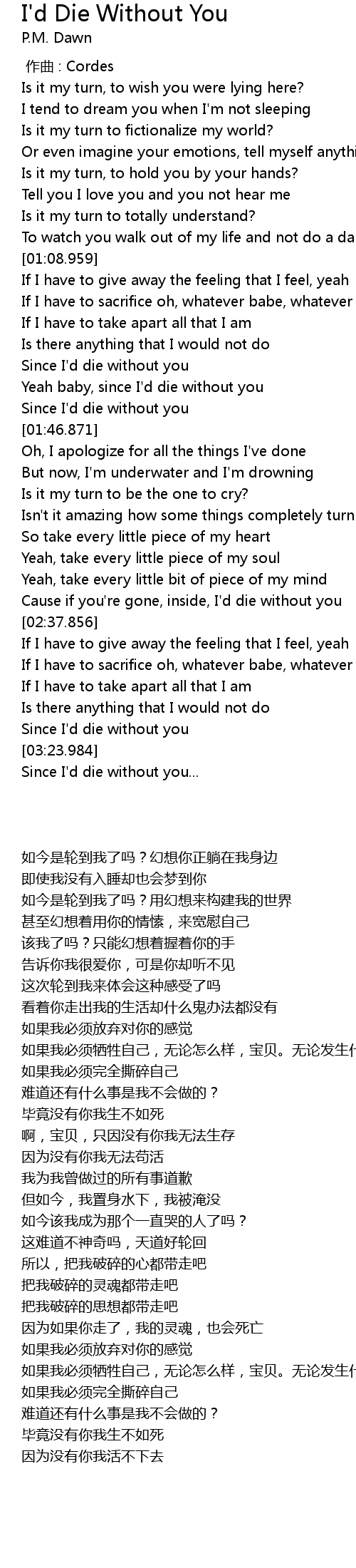 | [01:32.166] | Since I'd die without you |