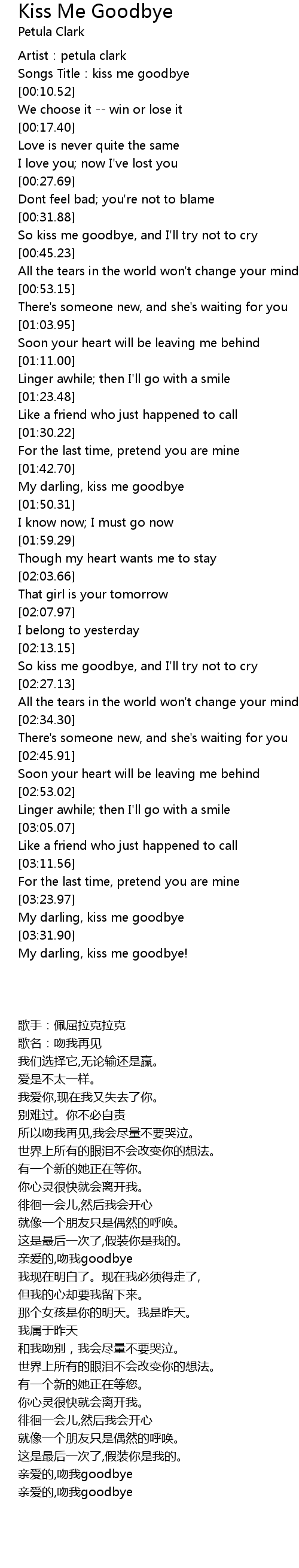 | [02:19.08] | So kiss me goodbye, and I' ll try not to cry |