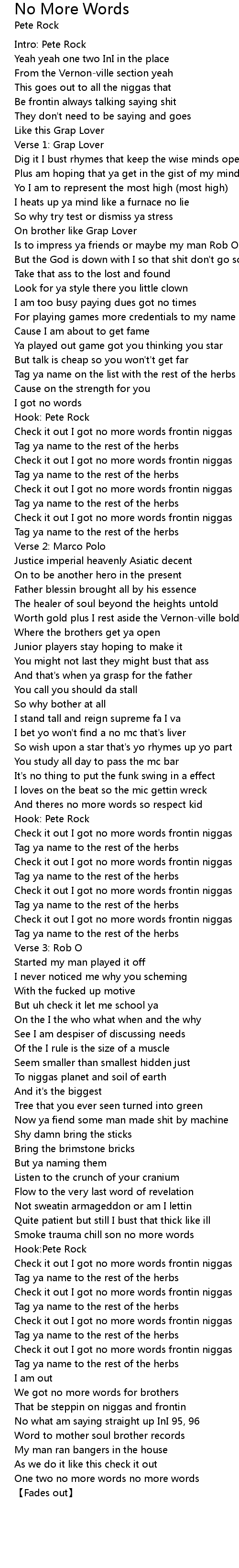 | [02:12.25] | Check it out I got no more words frontin niggas |