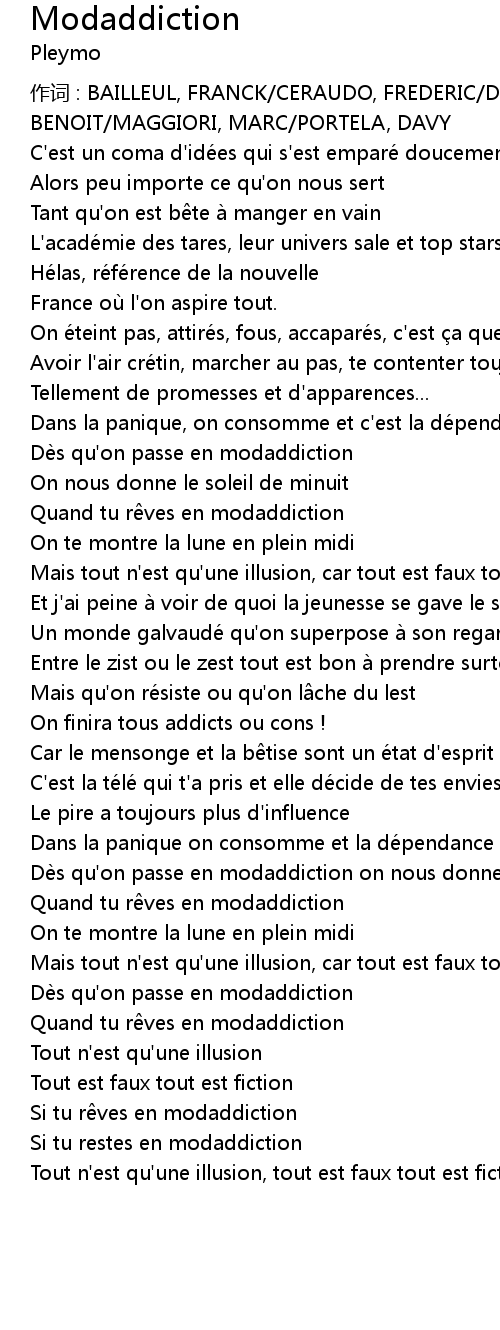 | 作词 : BAILLEUL, FRANCK/CERAUDO, FREDERIC/DEVILLOUTREYS, ERIK/JULLIARD, BENOIT/MAGGIORI, MARC/PORTELA, DAVY | |