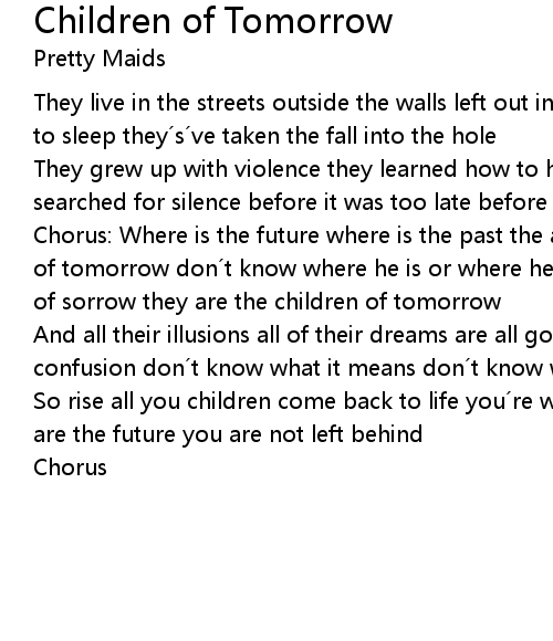| Chorus: Where is the future where is the past the answer s unkown but the child of tomorrow don t know where he is or where he shall go they are the children of sorrow they are the children of tomorrow | |