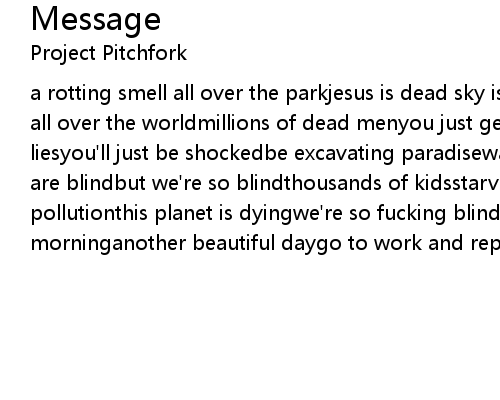 | a rotting smell all over the parkjesus is dead sky is like an arkthere are wars all over the worldmillions of dead menyou just get gripesfrom all these liesyou'll just be shockedbe excavating paradisewarning signs in the skybut we are blindbut we're so blindthousands of kidsstarve every minutewe're swimming in pollutionthis planet is dyingwe're so fucking blindsee the sun rise this morninganother beautiful daygo to work and repressthe decay |