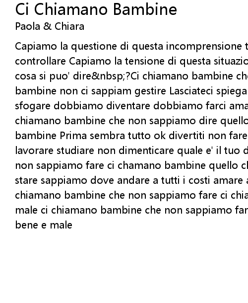 Capiamo la questione di questa incomprensione tra figlio e genitore non si puo' controllare Capiamo la tensione di questa situazione che cosa si puo' fare che cosa si puo' dire ?Ci chiamano bambine che non sappiamo fare ci chiamano bambine non ci sappiam gestire Lasciateci spiegare possiamo rimediare lasciateci sfogare dobbiamo diventare dobbiamo farci amare a tutti i costi amare Ci chiamano bambine che non sappiamo dire quello che e' bene e male ci chiamano bambine Prima sembra tutto ok divertiti non fare tardi che ah ah ah Domani devi lavorare studiare non dimenticare quale e' il tuo dovere Ci chiamano bambine che non sappiamo fare ci chamano bambine quello che e' bene e male Lasciateci un po' stare sappiamo dove andare a tutti i costi amare abbiamo un bel da fare Ci chiamano bambine che non sappiamo fare ci chiamano bambine quello che e' bene e male ci chiamano bambine che non sappiamo fare ci chiamano bambine quello che e' bene e male |