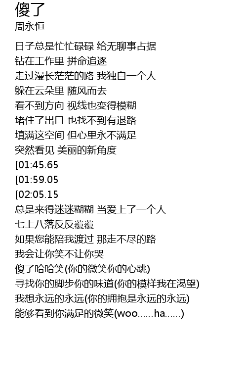 | [03:19.02][01:45.65] | 傻了偷偷笑 望著你的眼睛心在跳 |